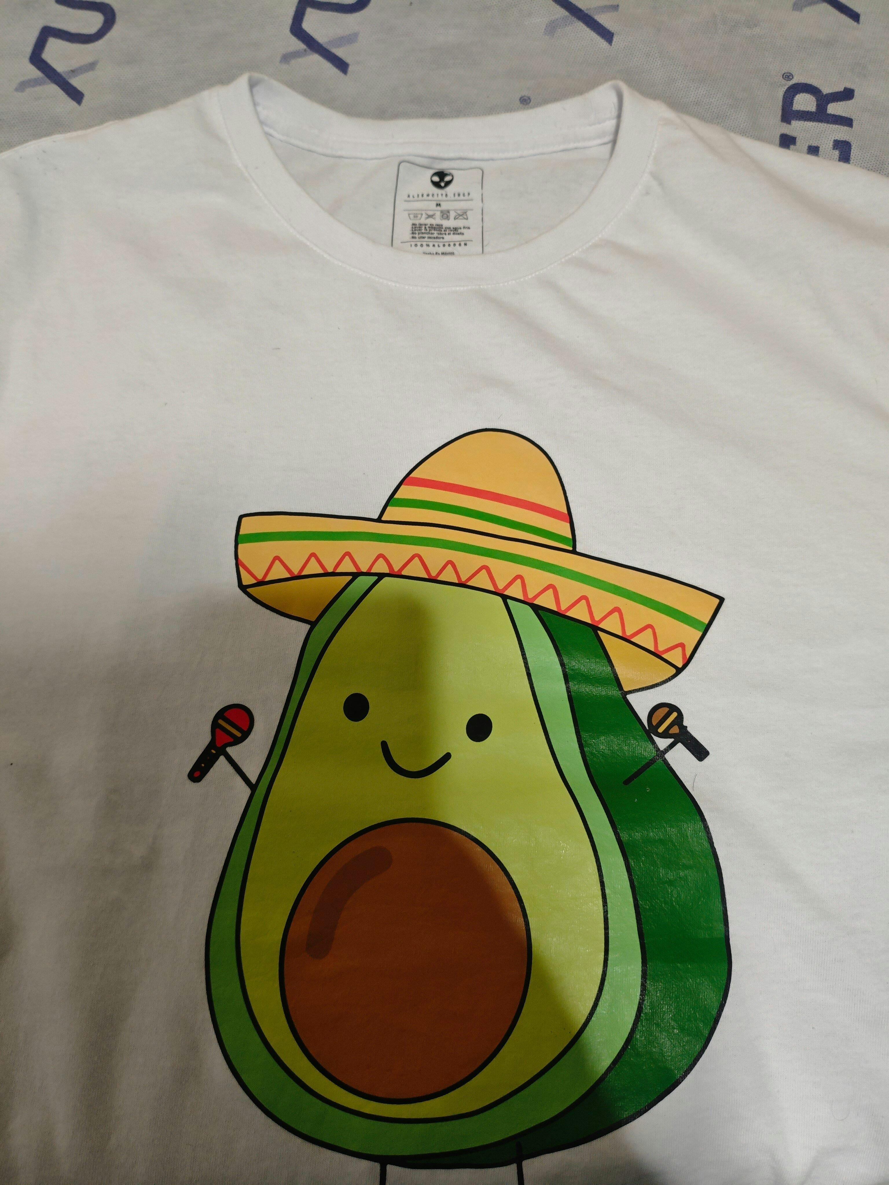 Playera con divertido aguacate mexicano con sombrero y maracas, ideal para fiestas patrias con un toque de humor y estilo.